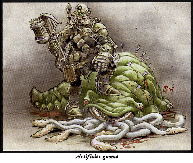 Les artificiers gnomes se reposent généralement sur la technologie pour créer des mécanismes fantastiques mais ils n'hésitent pas à manipuler la magie de l'ombre lorsque la technologie seule ne suffit pas à leur permettre de réaliser ce qu'ils désirent. Leurs armes, armures et équipements exigent un entretien régulier et des réparations constantes mais ils produisent des effets qui peuvent rivaliser avec bon nombre de sorts de magie profane.