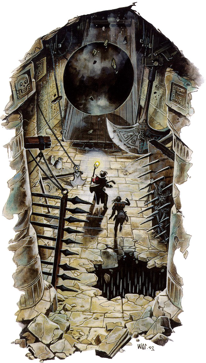 Ces pièges sont constitués de lames affûtées qui jaillissent des murs et de blocs de pierres qui tombent du plafond. Là encore, le concepteur fixe le bonus à l'attaque.