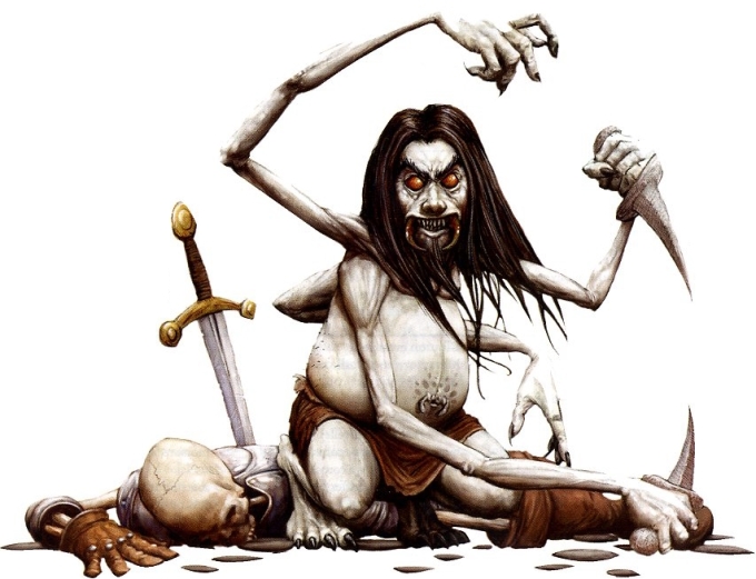 - Attaque à outrance : 3 épées courtes (+3 au corps à corps, 1d6) ou 3 javelines (+4 à distance, 1d6)