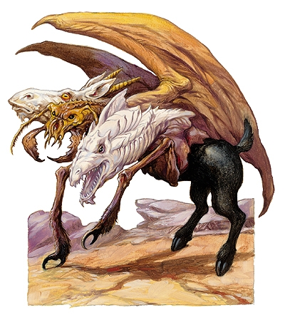 - Attaque : Une créature chimérique conserve toutes les attaques de la créature de base et obtient de plus une attaque supplémentaire de morsure pour 2d6 points de dégâts de sa tête draconique et une attaque de coup de tête pour 1d8 points de dégâts pour sa tête de chèvre. L'arme naturelle qui inflige les dégâts de base les plus importants devient son attaque principale. Si deux attaques sont à égalité, et que l'une d'entre elles inflige un effet secondaire (comme du poison), cette dernière est alors l'attaque principale. Si une égalité ne peut être résolue de cette façon, c'est au MD de choisir l'attaque principale parmi celles qui sont à égalité.
