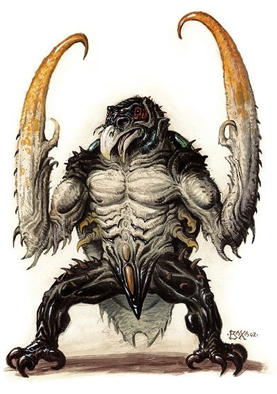 Cette créature mesure en moyenne 2,70 mètres de haut pour un poids d'environ 200 kg. Ses longs membres puissamment bâtis sont terminés par de redoutables griffes recourbées. Sa tête, armée d'un bec monstrueux, ressemble à celle d'un vautour. Son torse, qui évoque celui d'un scarabée, est recouvert d'une carapace très dure, dont l'aspect fait penser à de la pierre, hérissée de protubérances osseuses pointues.