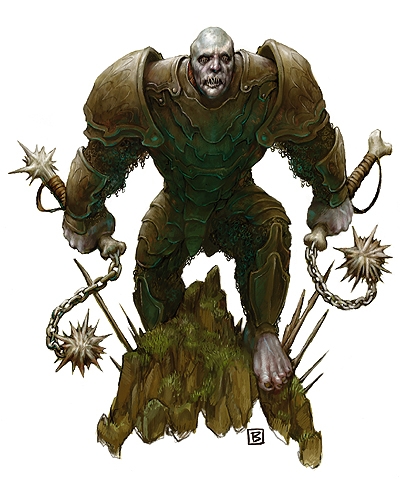 Le seigneur macabre est une brute imposante de forme humanoïde. Il a une peau gris cireux et une tête chauve sans oreille. Ses lèvres et ses paupières semblent avoir été cousue avec du fil bleu. La créature porte une crevice et manie deux fléaux d'armes légers vicieusement dotés de pointes.