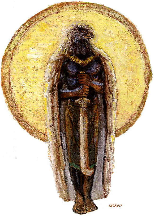 Le chef du panthéon pharaonique est le resplendissant seigneur du soleil. Rê-Horakhty conduit la Barque Solaire dans le ciel le jour et dans les enfers la nuit. Il a l'aspect un humain très fort, à la peau sombre et doté d'une tête de faucon.