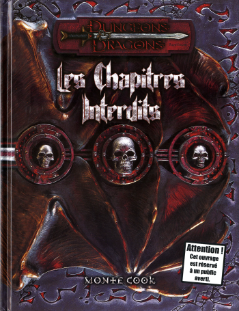 Les Chapitres Interdits est un guide consacré au Mal. Vous y trouverez une multitude de nouveaux éléments de jeu, tous particulièrement abominables, cruels, ignobles et répugnants. Un certain nombre de créatures, de sorts et d'objets maléfiques avaient déjà fait leur apparition dans de précédentes parutions, mais ce compendium s'attache uniquement aux aspects du Mal les plus infâmes, les plus affreux et les plus atroces que vous pourriez rencontrer en cours de jeu. Ses pages font référence à des actes d'une incroyable perversité et d'une extrême cruauté, et elles ne ressemblent à rien de ce que vous avez pu rencontrer auparavant dans le jeu Donjons & Dragons.