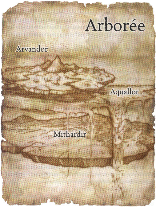 Arborée est divisée en trois niveaux. Celui du haut est le plus connu, il s'agit d'Arvandor, la résidence de la Cour Elfique et l'ultime demeure de beaucoup d'esprits d'elfes bons et de leurs alliés. Le second niveau, Aquallor, est entièrement constitué d'eau. Le troisième, et le plus profond, des niveaux connus s'appelle Mithardir, et c'est une plaine de poussière blanche.