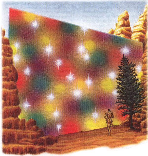 Ce sort fait apparaître un plan opaque et vertical composé d'un arc-en-ciel de couleurs toujours changeantes qui protège son créateur contre tout type d'attaque. Le mur est immobile et le mage peut rester à côté (ou même le franchir) sans risque. Par contre, toute autre créature de moins de 8 DV se trouve automatiquement aveuglée pendant 2d4 rounds si elle commet l'imprudence de regarder la barrière de couleurs alors qu'elle se trouve dans un rayon de 6 mètres de celle-ci.
