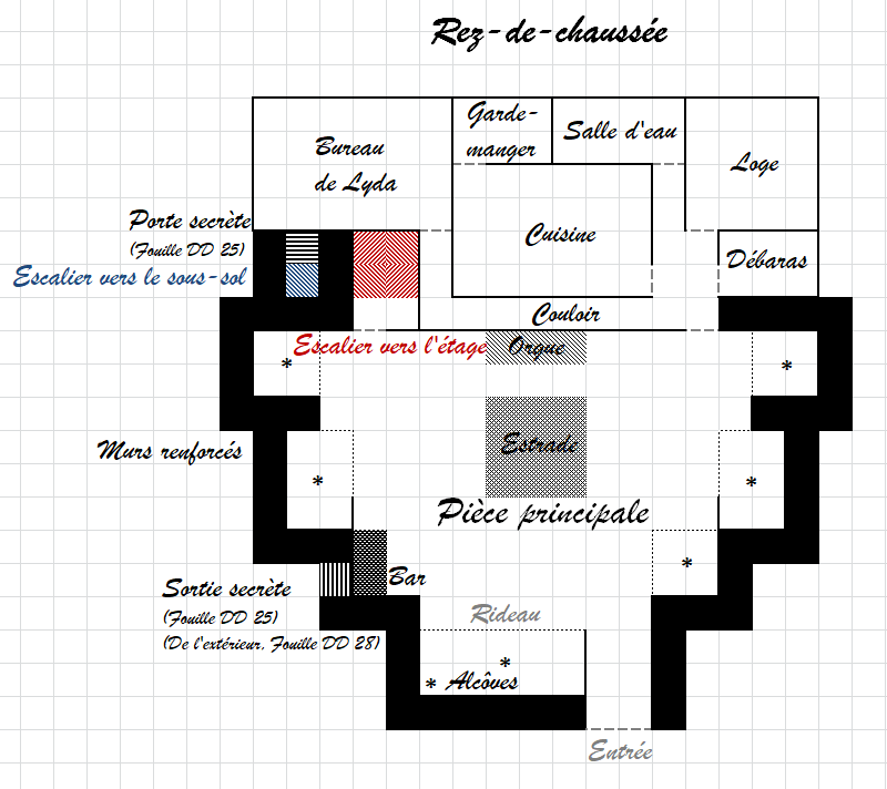 L'entrée principale donne directement dans la salle principale, une grande salle au plancher élégant, éclairée uniquement par des chandeliers allumés. Aucune fenêtre ne se trouve dans cette salle, dont les murs sont plutôt occupés par de confortables alcôves, six au total. Celles-ci peuvent être closes par des rideaux aux tons bordeaux, et sont drapées de tissus aux couleurs similaires. De taille variable, elles peuvent accueillir de 2 à 12 convives, pouvant recevoir la visite de la fille de leur choix. Cependant, les relations les plus taurides ont plutôt lieu à l'étage.