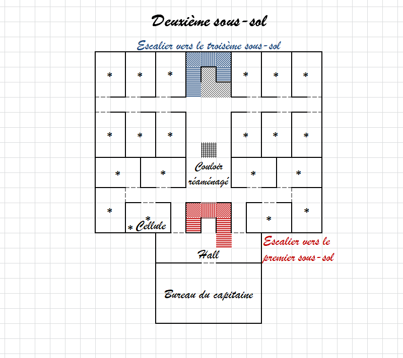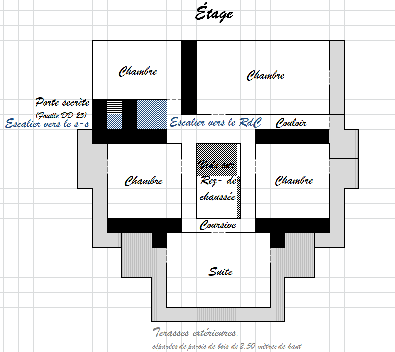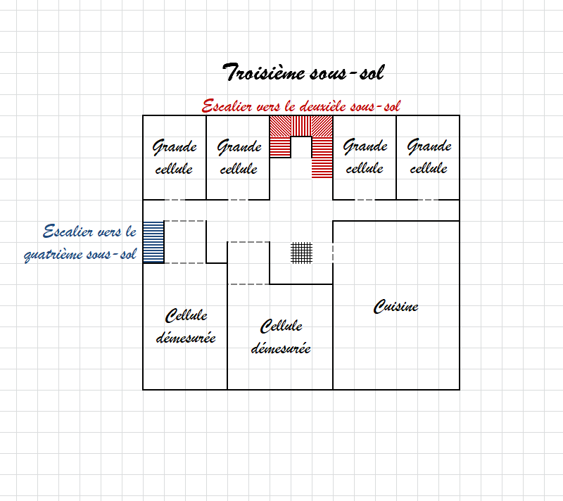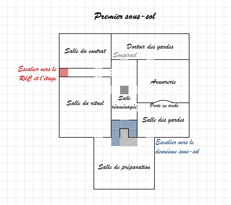 Sur les quatre côtés de cette pièce, des soupiraux se vingt centimètres de haut et fermés par une grille relient les pièces voisines. Un test similaire permettra de dire qu'ils sont également des ajouts postérieurs à la construction des lieux. Une réussite de 5 point au dessus du seuil les datera à quelques années au plus, tandis que le lieu semble au moins séculaire.