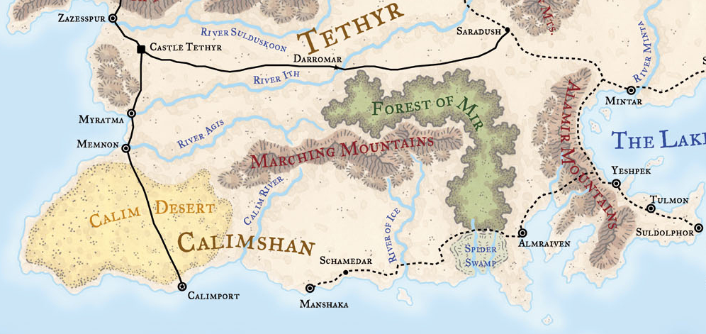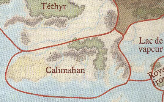 Le Calimshan s'étend le long de la côte nord de la Mer étincelante sur plus de huit cents kilomètres et inclut toutes les terres au sud du fleuve Agis et des Montagnes mouvantes.