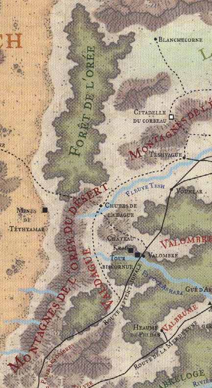 Les murs de pierre des Chutes de la dague ne sont pas très élégants, mais ils offrent aux habitants de Valdague un refuge sûr au milieu de ces terres en proie à de nombreux troubles. La ville fortifiée est située au nord-ouest du Gué de la dague, à l'endroit où la Voie de Téthyamar traverse le fleuve Tesh sous les chutes. Les pierres de taille et les toits d'ardoise en pente des bâtiments de la ville leur ont permis de survivre aux importantes neiges hivernales.